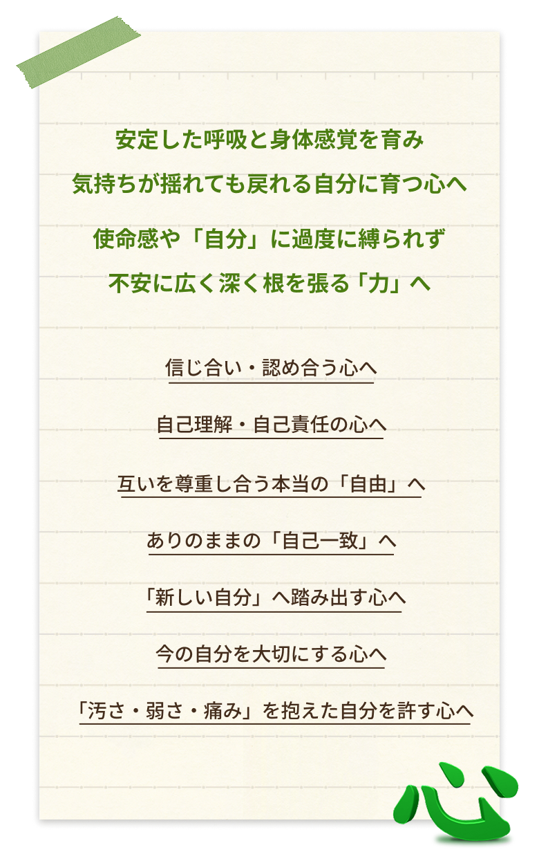 子どもから大人まで、個人・ご家族・ご夫婦の「こうありたい」という想いに寄り添い、悩みや不安、怒り、悲しみ、喪失感などの感情を丁寧に扱いながら、自己理解と回復を支援します。